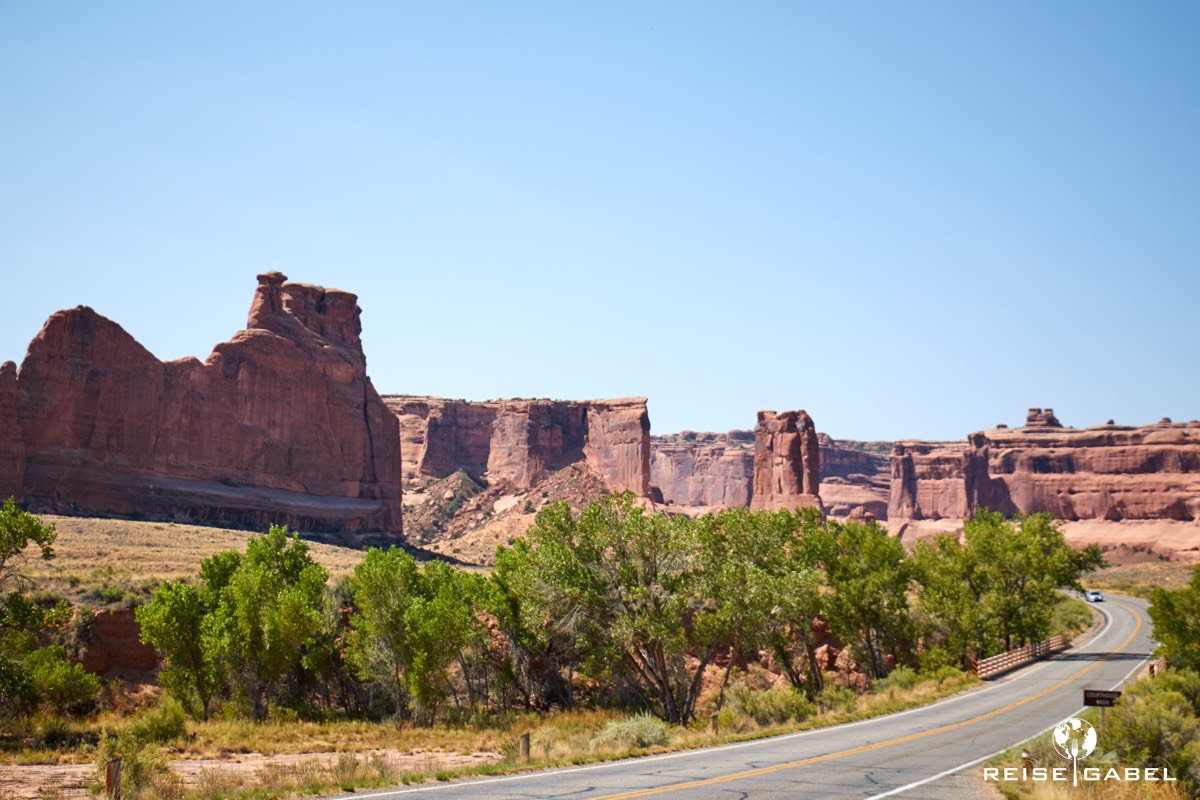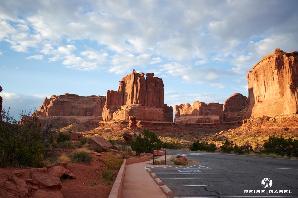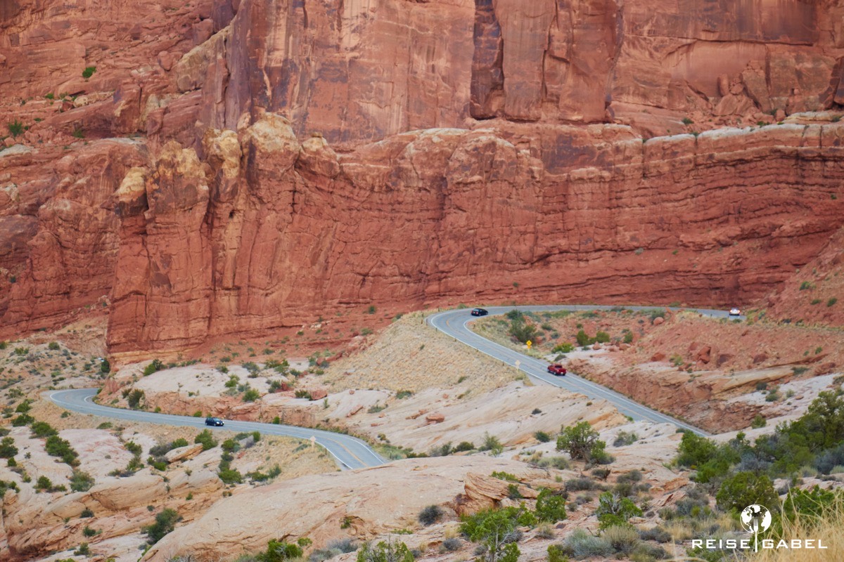 Unsere Strategie ist schnell klar. Wir fahren den Arches Nationalpark zunächst komplett bis zum Ende durch. Von dort arbeiten wir uns Stück für Stück zurück. Der Grund ist simpel: Parkplätze. Es kann jederzeit passieren, dass man einen Aussichtspunkt auslassen muss, weil einfach kein Platz mehr ist.