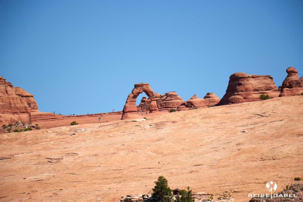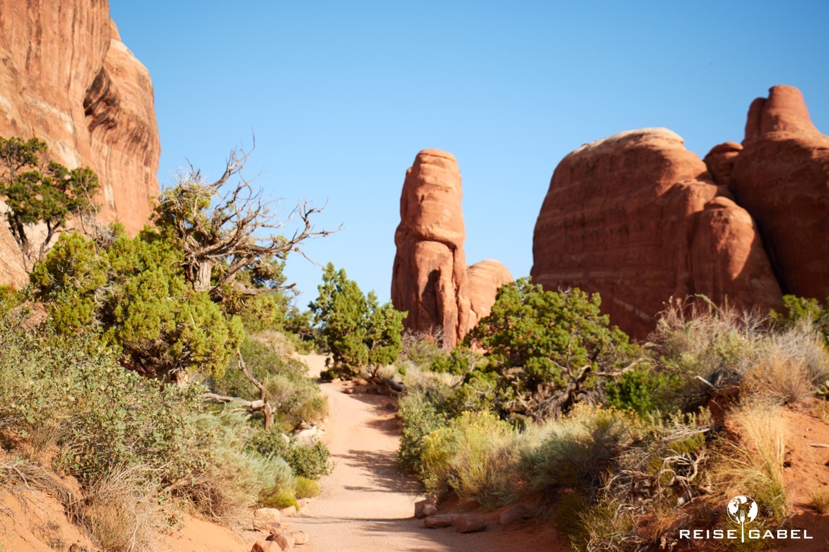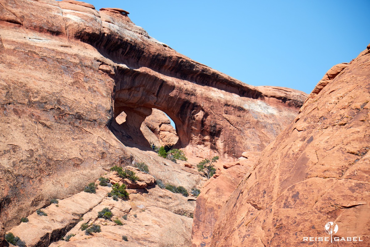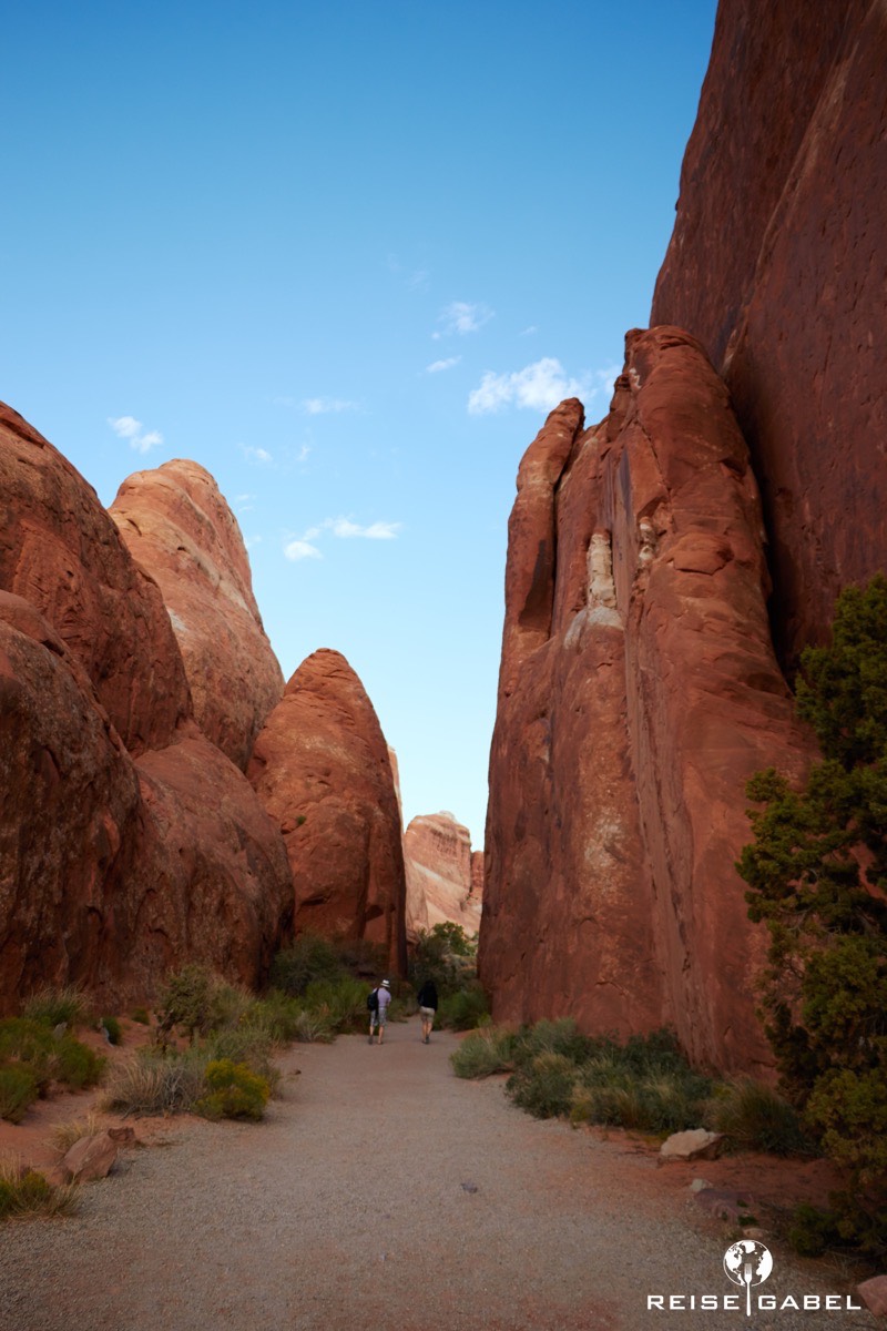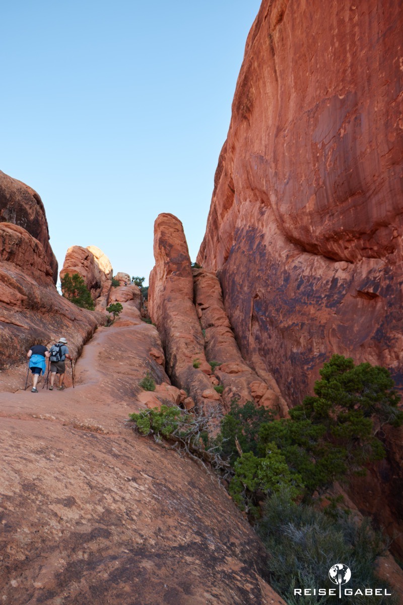 Man merkt schnell, dass der Arches Nationalpark kein Spaziergang ist. Geeignetes Schuhwerk ist Pflicht. Ebenso ausreichend Wasser. Manche Stellen sind steil, andere ausgesetzt. Ein falscher Schritt kann hier schnell unangenehm werden.