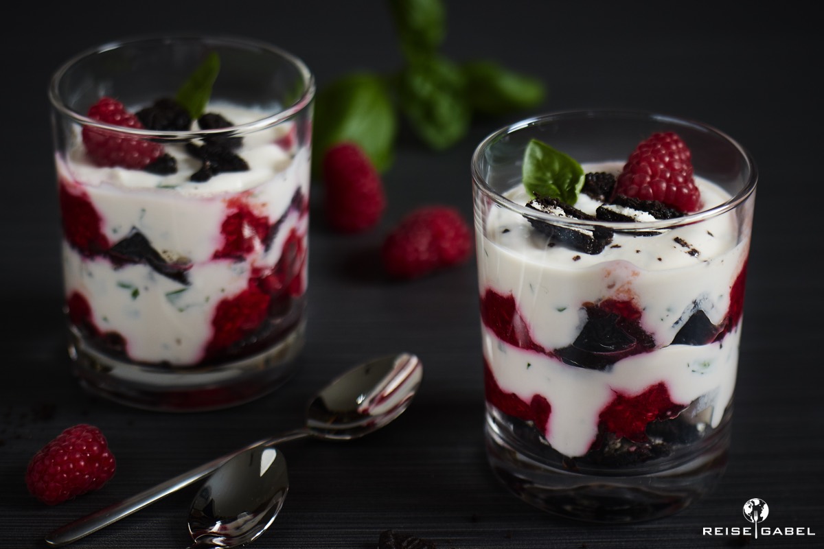 Schichtdessert mit Oreo Keksen, Himbeeren und Essig {Werbung}